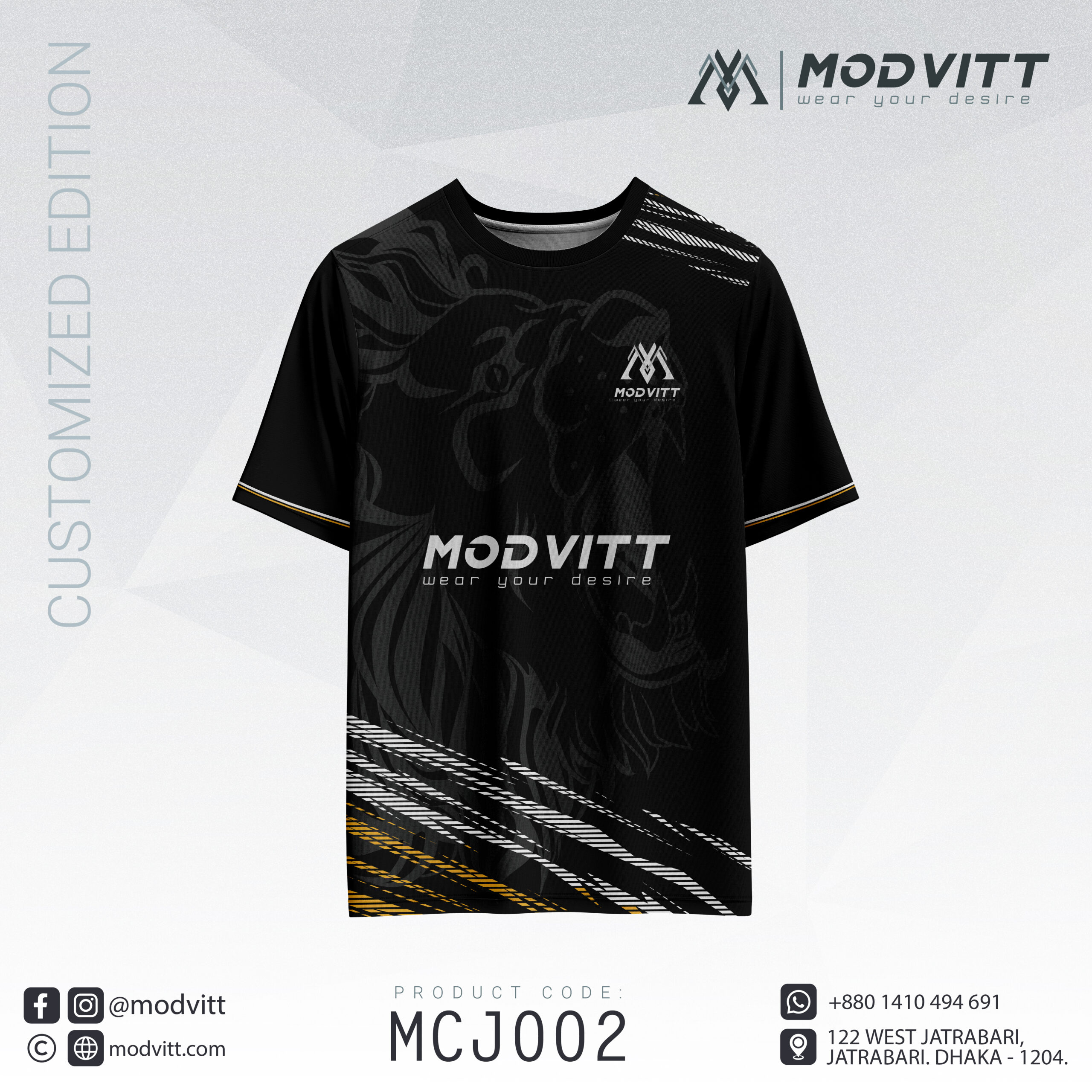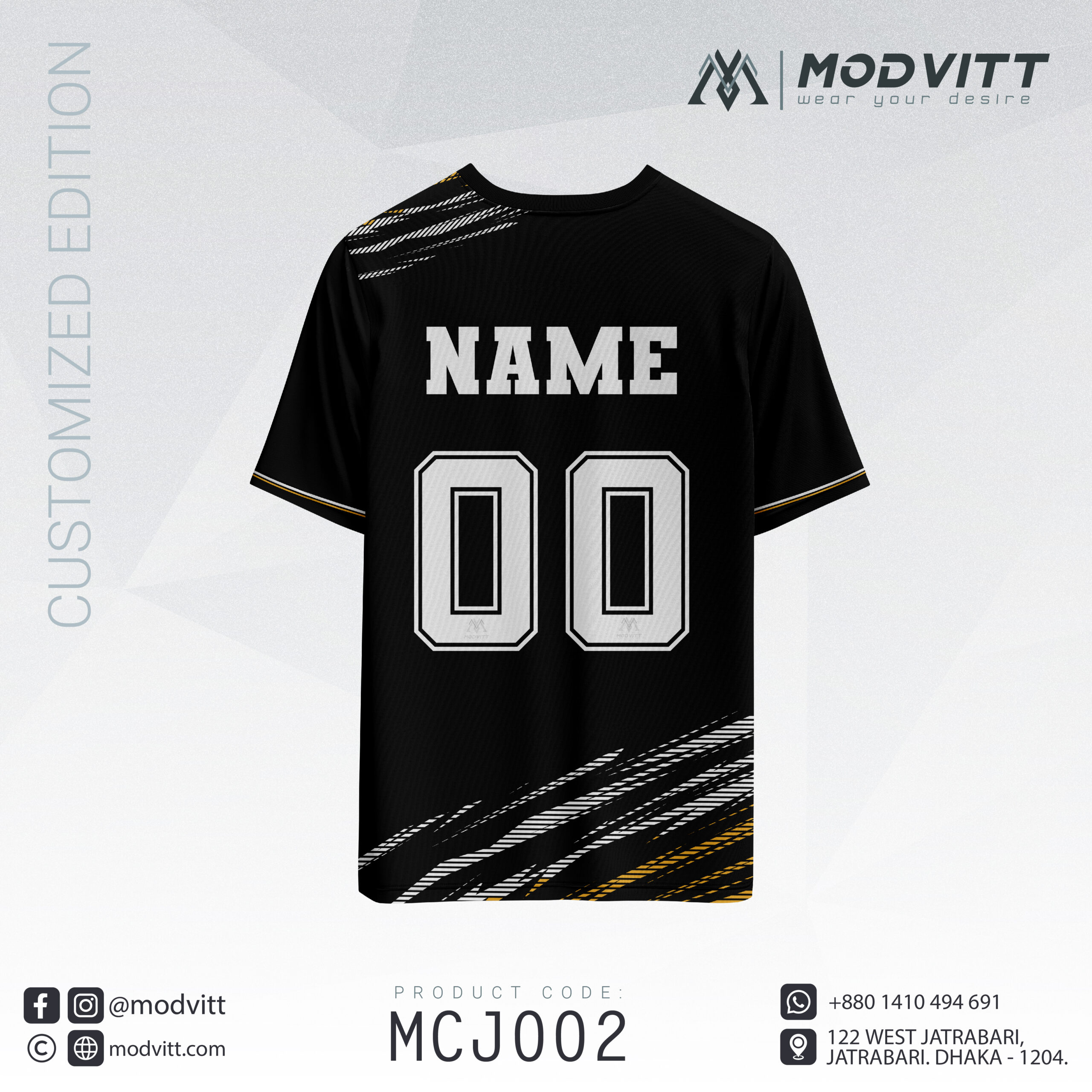 Unleash your power with MODVITT ShadowStrike, a bold black and gold customized jersey designed for athletes, competitors, and trendsetters.